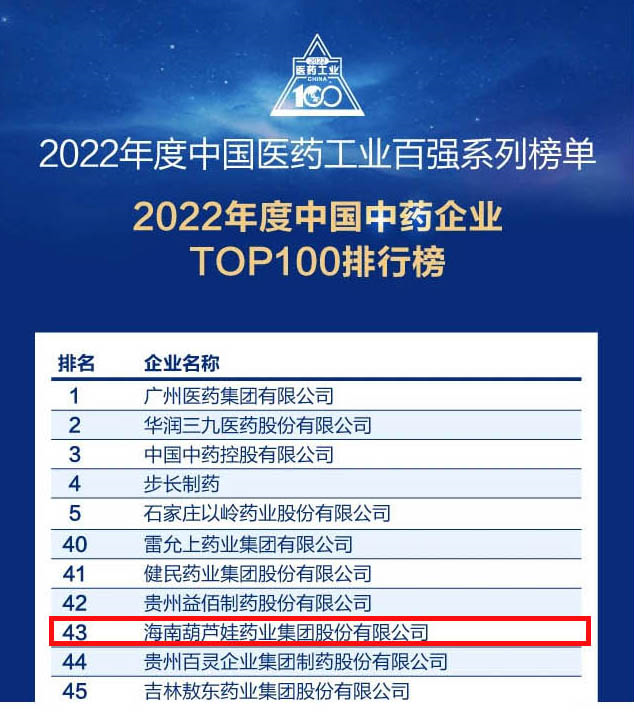 会议期间,一年一度的中国医药工业百强系列榜单隆重揭晓,BG视讯药业集团凭借领先的研发优势和扎实的生产实力以及稳健的市场推广能力,连续第四年成功入选“2022年度中国中药企业TOP100排行榜” ,排名稳步上升至第43位。